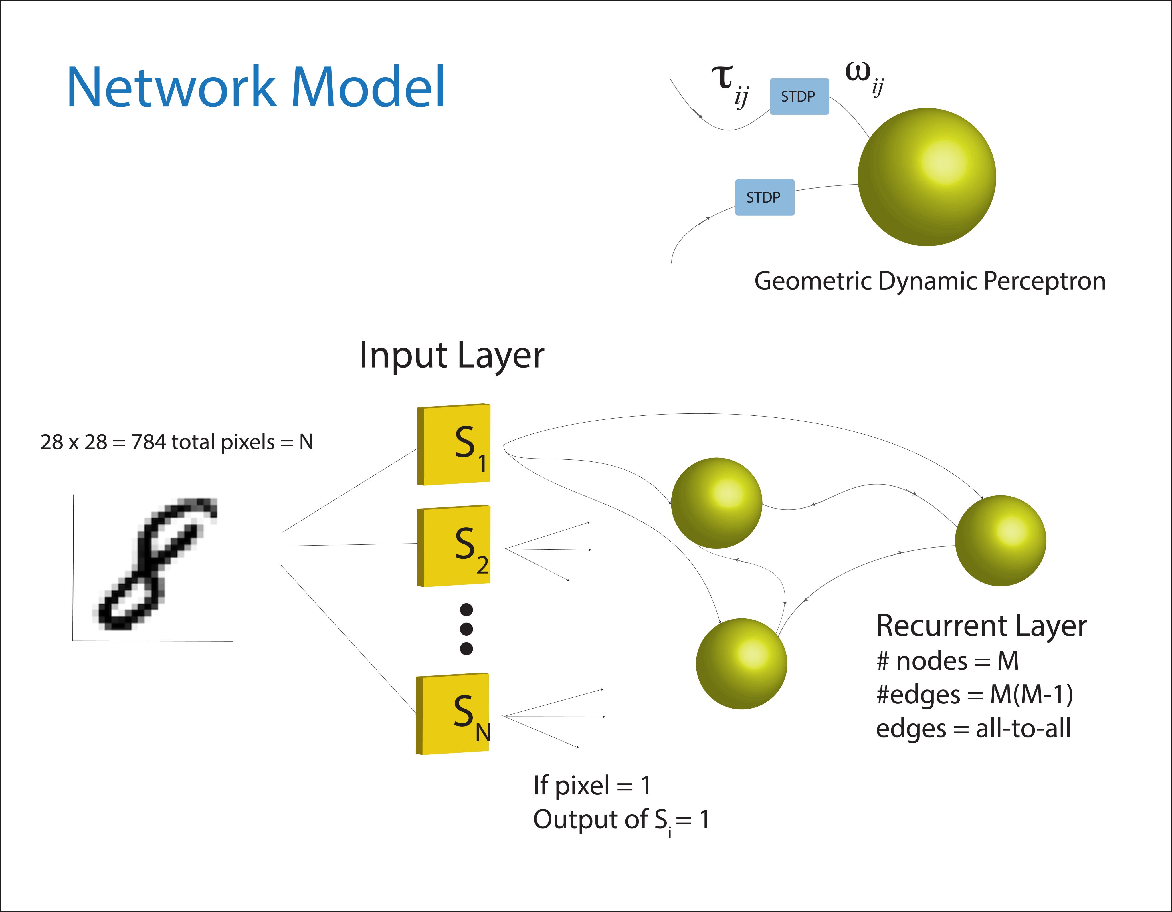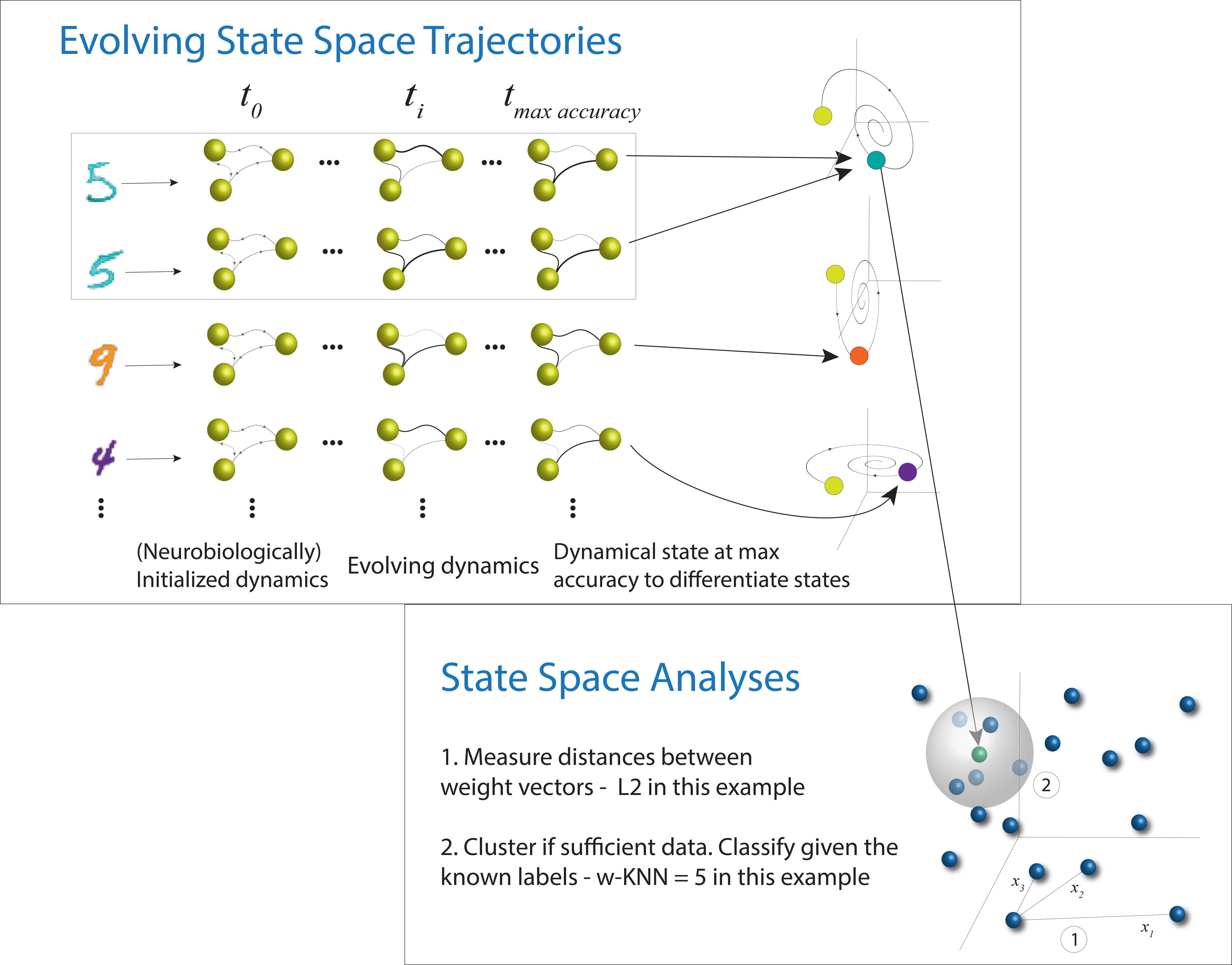 The triggered input neurons set off a cascading dynamics through the geometric network that 'carves' out a dynamic path that is unique to the input data that triggered it. These dynamic patterns are then encoded as a single point in a metric space. And because it is a metric space distances between points can be measured and back end classification algorithms (such as k-nearest neighbors or even other neural networks) can be used to determine how related different points in the metric space are to each other.