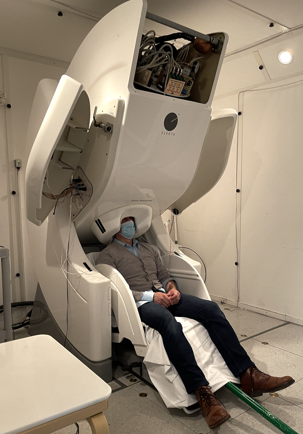 To do the necessary measurements we use a unique and highly sophisticated brain imaging machine that measures magnetoencephalograms (MEG). Orthogonal to every electric field, like the one produced by the electrical activity in the brain, is always a magnetic field. The MEG measures the magnetic fields produced by the brain. But because they are so small - about a billionth the size of the earth's magnetic field - this instrument needs to be incredibly sensitive and highly shielded or the fields simply get lost in the much larger magnetic field of the earth.